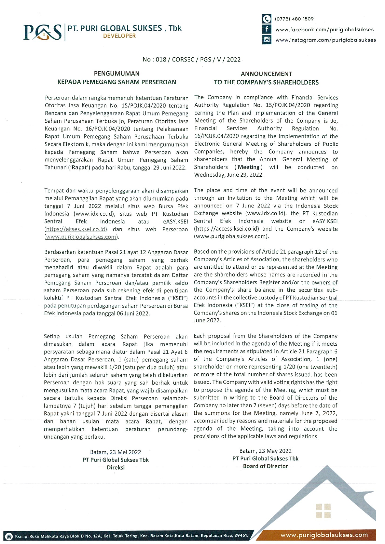 Pengumuman RUPS PT. Puri Global Sukses Tbk 2022