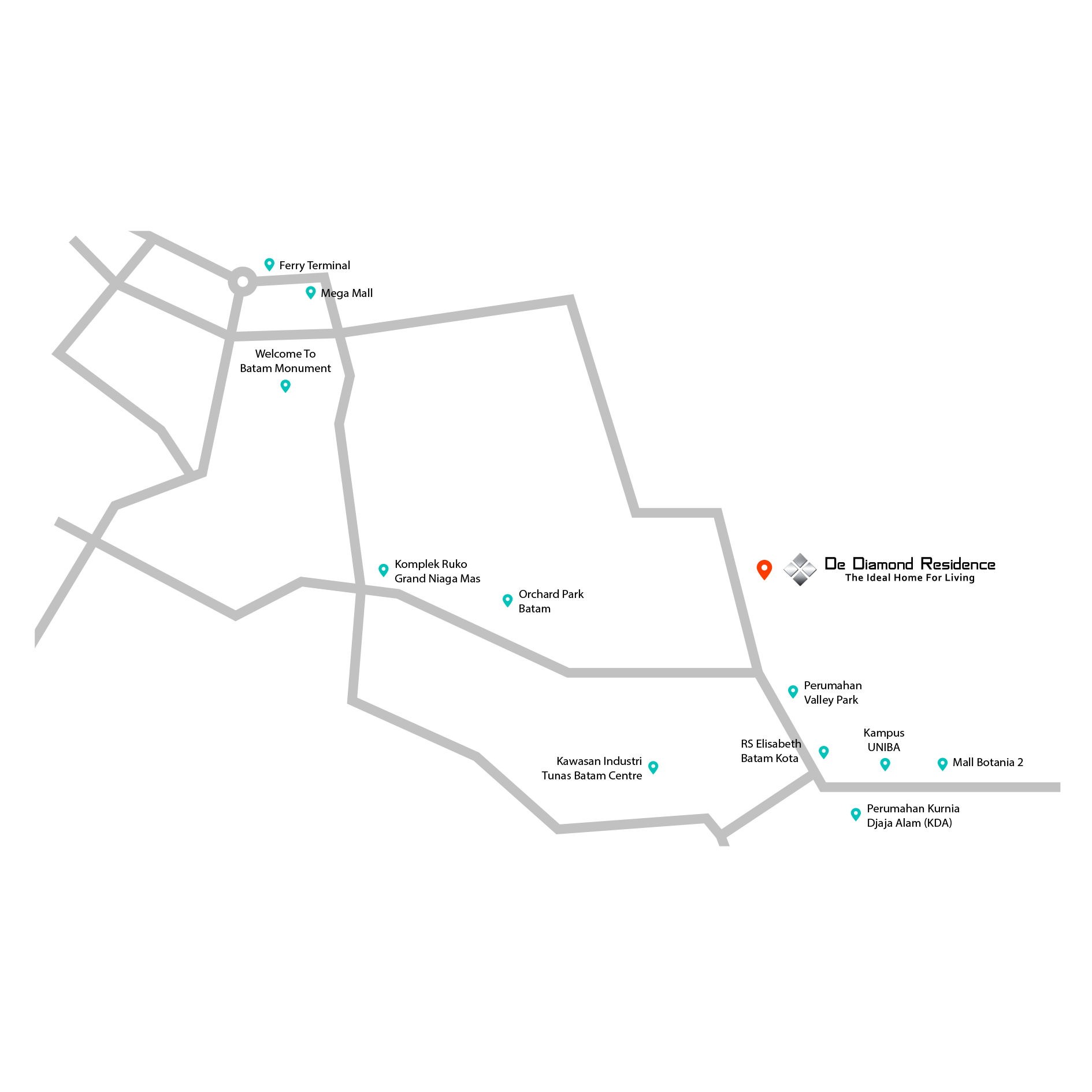 De Diamond Residence housing is located in a very strategic location, close to Elizabeth Hospital, UNIBA Campus, International Ferry Terminal, Mega Mall and Botania 2 Mall